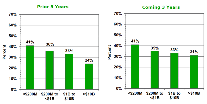 With a diverse population in the respondent pool, company size and industry stratifications add much to analysis of the results. Figure 9 stratifies actual and planned automation by company size cohort. The incidence of automation activity is revealed to be an increasing function of size. As shown, 74% of the responding population in the smallest size cohort (average annual global sales revenues of less than $200 million for the past three fiscal years) engaged in automation investment activity in the five years prior to the survey. Within this cohort, 64% noted that they plan to automate in the three years following the survey. On the other extreme, 97% of respondents in the largest size cohort (revenues greater than $10 billion) engaged in automation investment activity in the prior five years and 90% plan to automate some aspect of their product-producing process in the following three years.